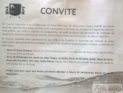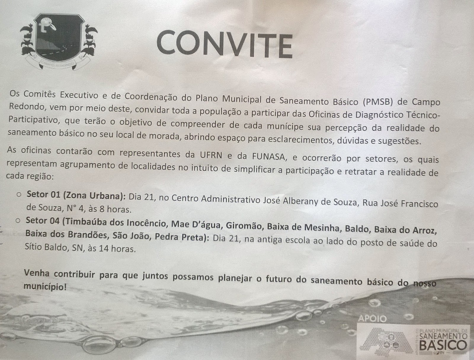 A Prefeitura Municipal de Campo Redondo, através da Secretaria Municipal de Trabalho, Habitação e Assistência Social, realizará no dia 07 de julho, segunda-feira, às 8hs, no Clube dos Idosos, a 11° Conferência Municipal de Assistência Social de Campo Redondo.