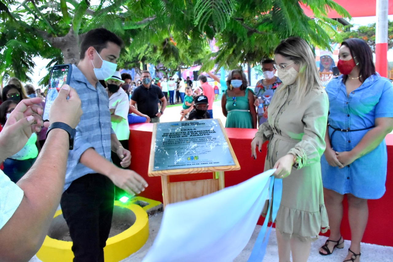 Em seguida foi à vez da entregar da Praça Prefeito Francisco Rodrigues da Rocha, que ganhou cobertura, iluminação, parque infantil, arborização e espaço para food truck. Uma das maiores pinturas em grafite do estado, assinada pelo artista Miguel Carcará, onde conta a história da cidade, também encanta o local.