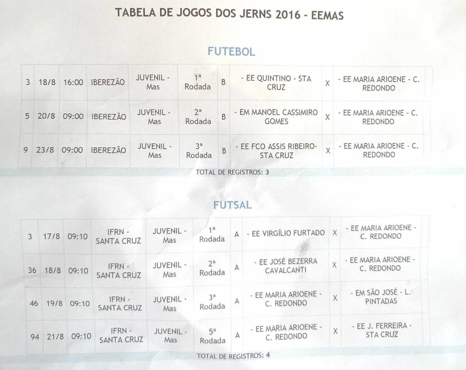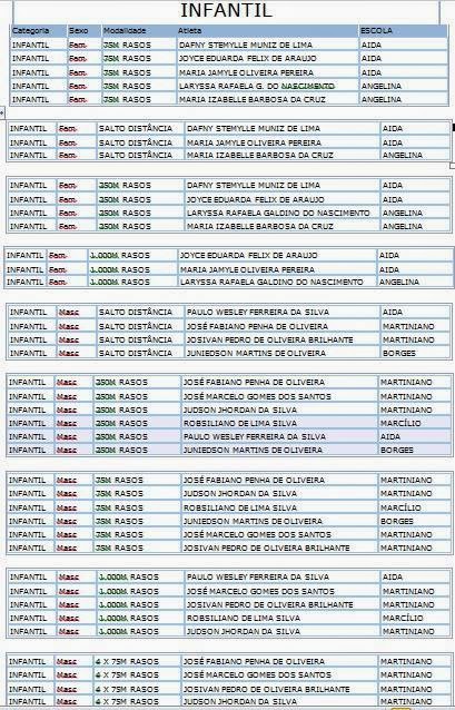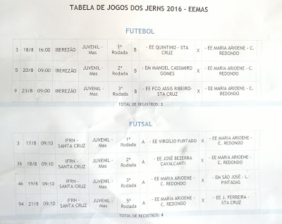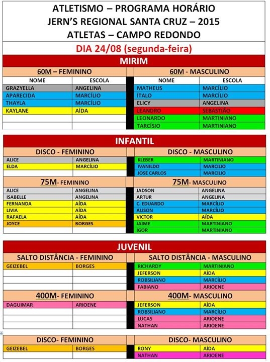 Confira a Tabela do atletismo, do futsal com a relação dos atletas das três escolas municipais de Campo Redondo que participarão da 8ª edição dos JERNS da Regional Trairi e Potengi que terá sua abertura na próxima segunda-feira, dia 14 de julho a partir das 16 horas no estádio Iberezão em Santa Cruz/RN.