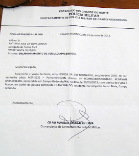 E ainda; Hoje Kerginaldo Ferreira nos procurou e relatou que o filho Wellington foi abordado por policiais neste último sábado, dia 22 sendo tratado como um criminoso, isso porque o rapaz ficou chateado porque o mesmo reclamou com os policiais por eles não ter o ajudado naquele sábado pela agressão sofrida. Pergunto, qual o verdadeiro papel da polícia? Chamamos a atenção do Comandante do Destacamento Policial de Campo Redondo para este fato, de outra forma o amigo Kerginaldo Ferreira irá acionar as instâncias superiores.